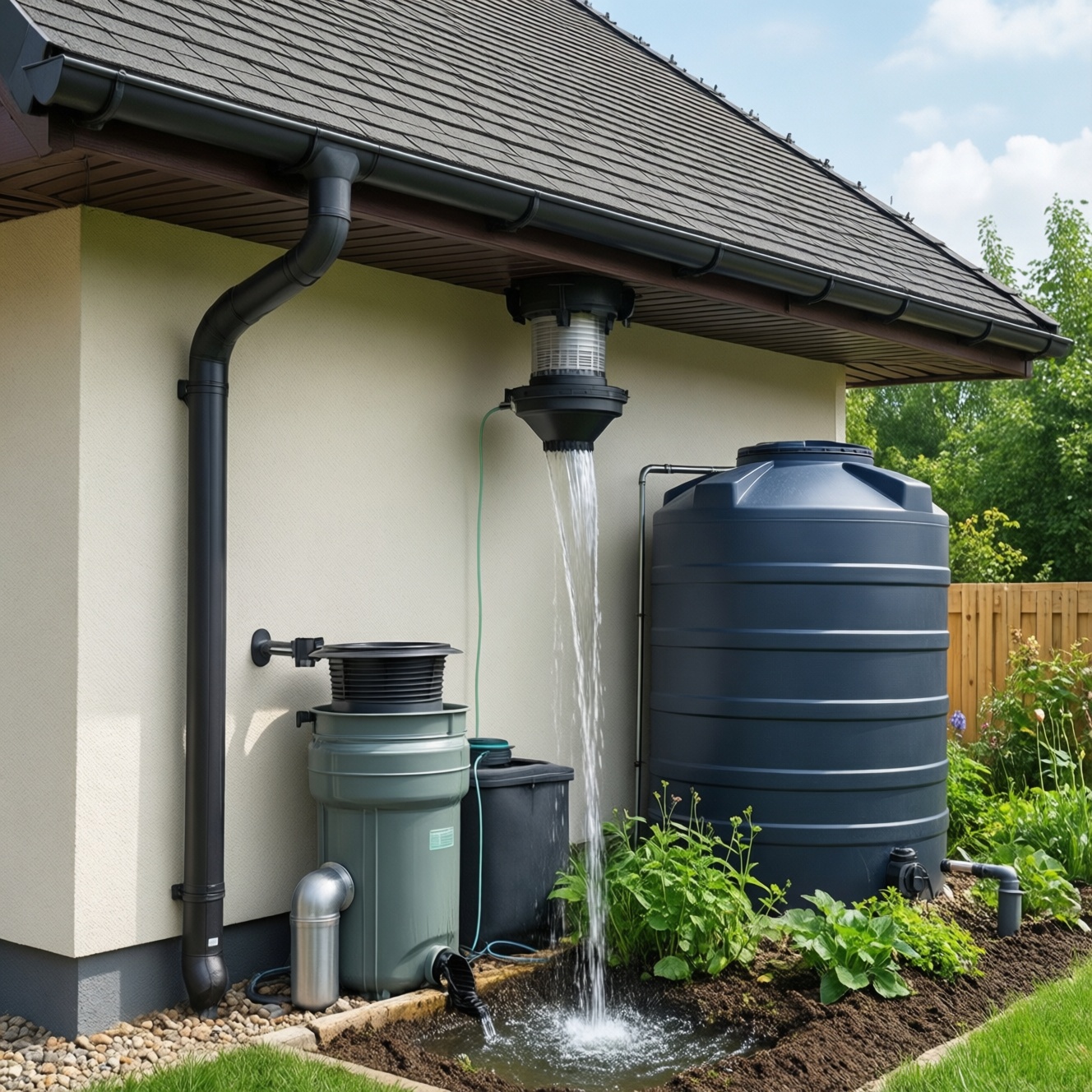 6. Проверка герметичности и сценария переполнения - пролейте систему водой, проверьте соединения, работу first flush и то, куда уйдёт перелив при сильном дожде. Исправьте всё до постоянной эксплуатации.