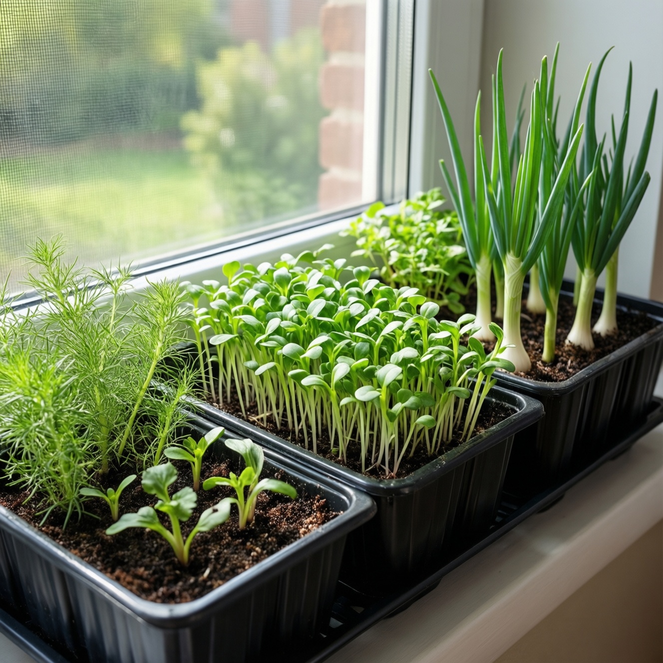 - Самые надёжные "круглогодники" для квартиры: зелёный лук, укроп, петрушка, базилик, кинза, листовые салаты, микрозелень.