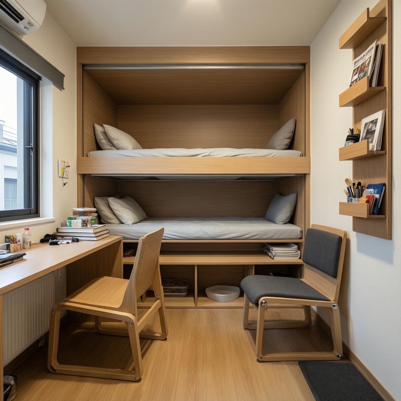• Под подоконником: неглубокий шкаф/комод 20-30 см под канцелярию, зарядки, бытовую химию (если нет радиатора или сохранена вентиляция).