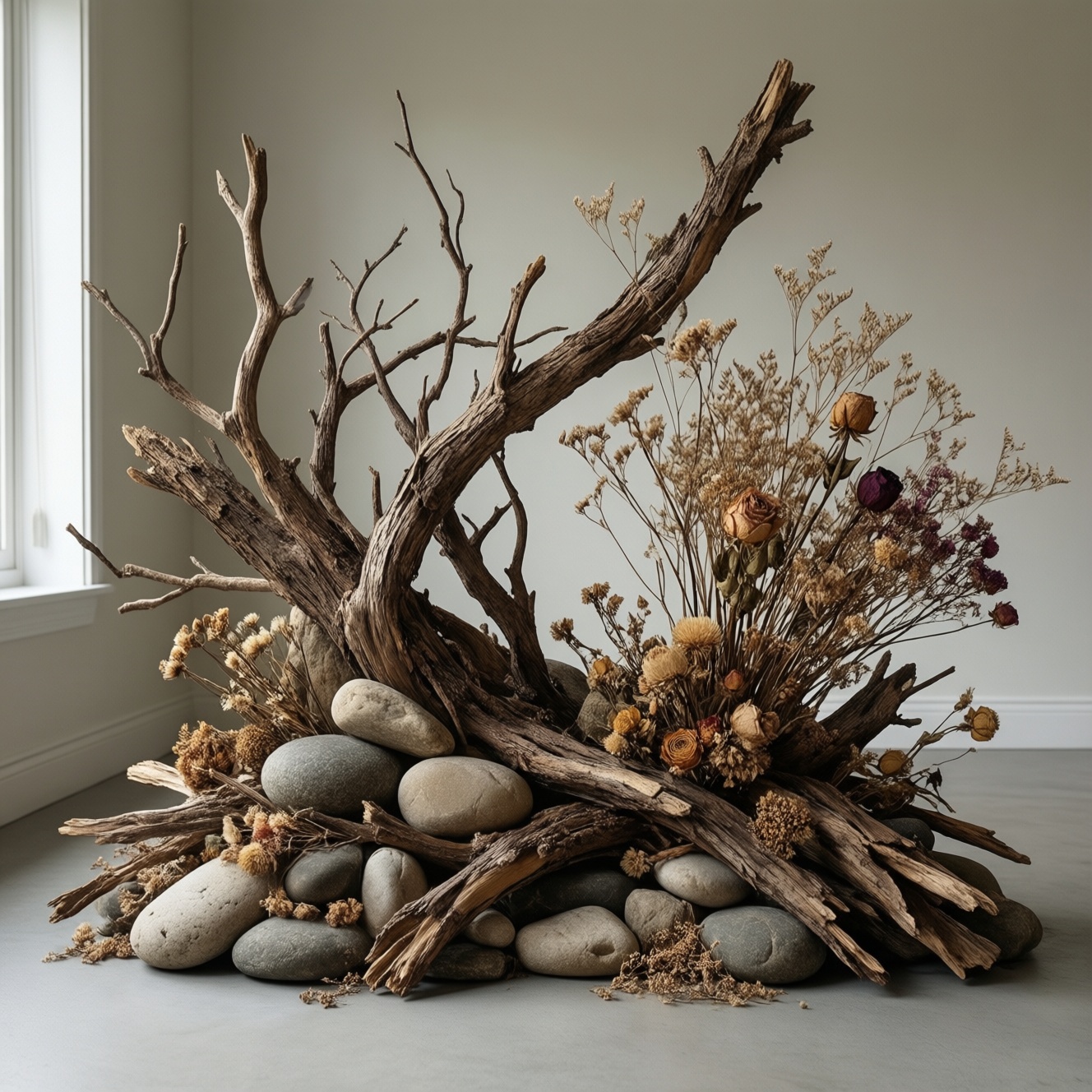 - Лофт/индастриал: грубая ветка + камни на металлическом подносе, чёрные крепления; хорошо работает рядом с бетоном, кирпичом, тёмным деревом.
