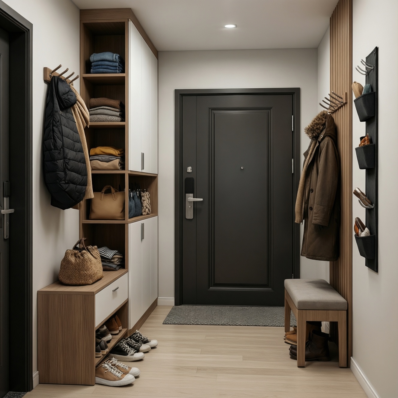 - Для семьи с детьми: нижний ряд крючков на детской высоте + корзины/ящики "каждому по секции".