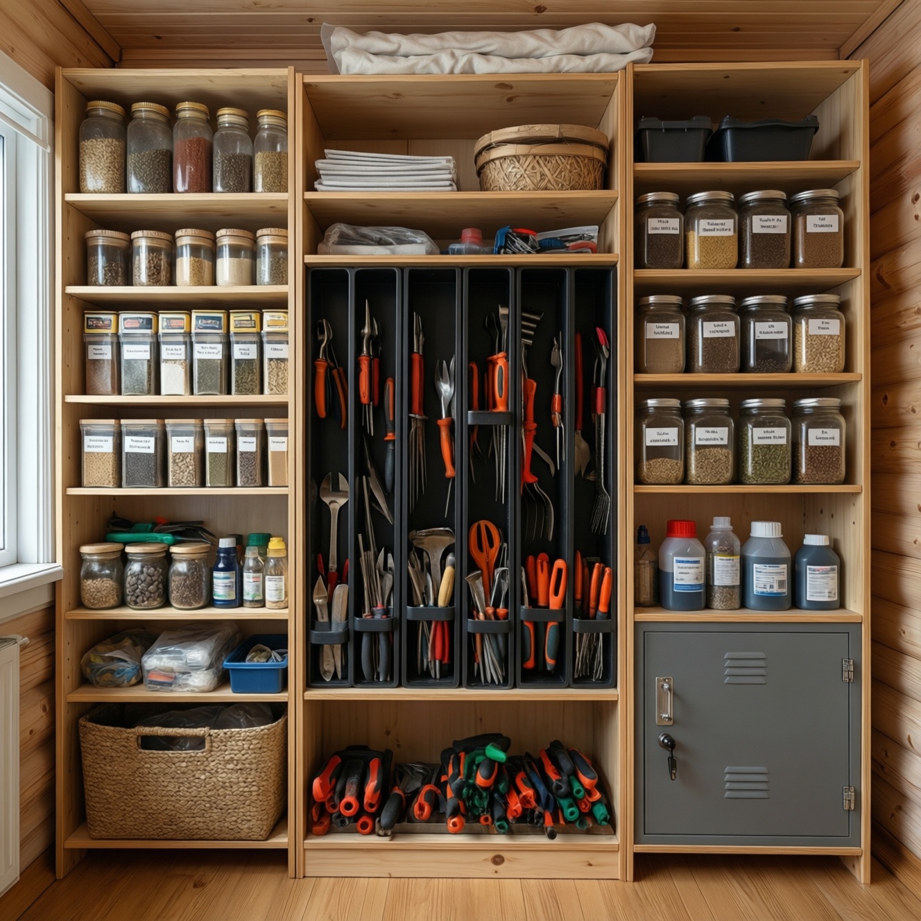 - Премиум: модульная система с закрытыми секциями. Подходит, если много мелочёвки и есть дети/домашние животные: закрытые шкафы под химию и расходники, открытая панель под безопасный инструмент.
